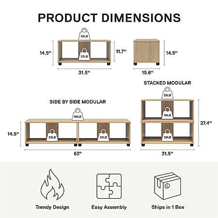 • Dimensions and Assembly: Assembled side-by-side: 63" W x 15.55" D x 14.59" H; Assembled stacked: 31.5" W x 15.55" D x 27.58" H; Weight: 43 lbs. Requires two adults for assembly.