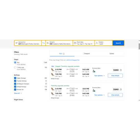 Skytrax rated 4-star Etihad Airways via Booking.com have round trip airfares travelling from Washington DC (IAD) to Jakarta Indonesia (CGK) for $840, making 1 stop in Abu Dhabi UAE both ways for 2-21 hours, so plan ahead. Stopover duration depends on the flights you choose. This is a basic economy fare that only allow a personal item and a carry-on bag. You have an option to pay an additional $50 round trip for 2 checked bags.