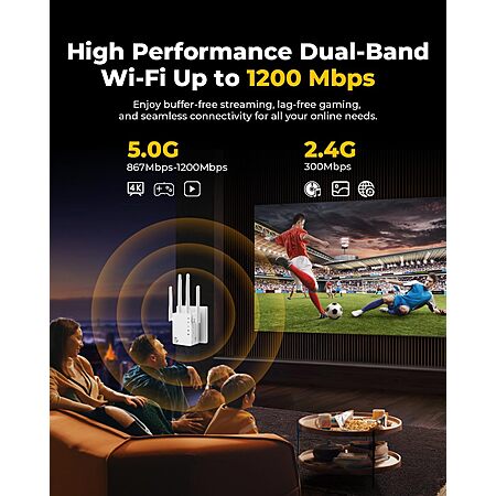 5GHz/2.4GHz dual-band signal booster with 1.2Gbps transmission speed, optimizing performance for high-definition streaming, online gaming, and video calls.