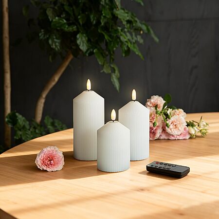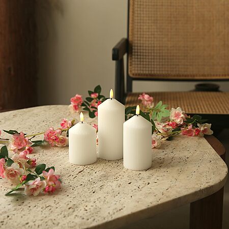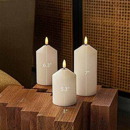 • 【Ultra-Realistic Flicker & Long-Lasting Glow – Mood-Enhancing Ambiance】True-to-Life Flickering Effect – Patented LED technology mimics natural candle movement. This decorative flameless candle set includes three real-wax LED candles (3" diameter) in graduated heights (5.3", 6.3", 7") to create staggered elegance in any place like coffee tables, kitchen countertops, dining tables, office desks, bookshelves, fireplace mantels, or entryway consoles.