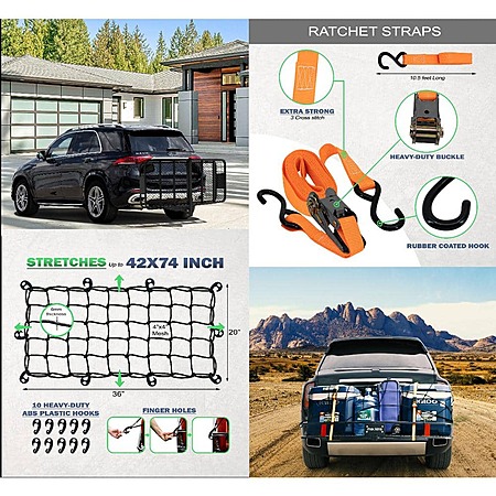 - Two sets of ratchet straps and a cargo net with 10 hooks allow you to secure luggage of all shapes and sizes.