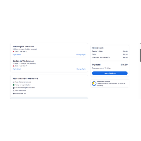 JetBlue, American, Delta and Expedia have round trip airfares travelling to and from Washington DC (DCA) and Boston (BOS) for $117, nonstop. These are basic economy fares that allow a personal item and a carry-on bag. There is no seat selection and no change. If you are travelling with children on JetBlue, you will be seated together as per JetBlue's policy. Delta decides that on a case-by-case basis.