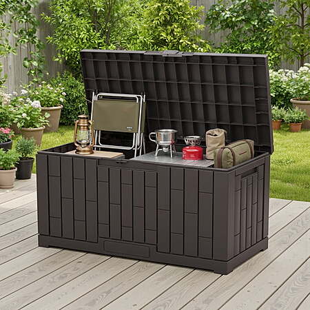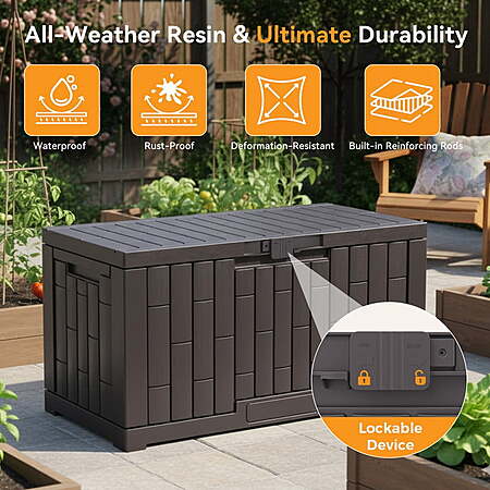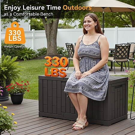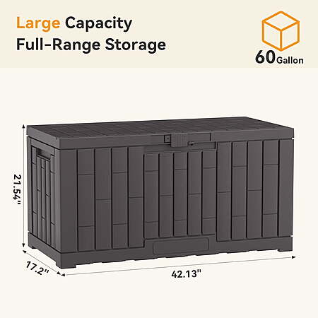| Product Description: | This 60-gallon deck box is crafted from durable, UV-resistant resin for long-lasting outdoor use. Fully waterproof and lockable, it securely stores patio cushions, gardening tools, pool supplies, or outdoor toys. Reinforced with sturdy hinges and a lid that doubles as a seat, it’s perfect for patios, decks, or balconies—combining practical storage with clean, modern design. Quick Assembly & Strong Bench-Style Design: Set up this durable storage container in just 10 minutes—no tools needed. With a 330-lb weight capacity, the deck boxes outdoor waterproof also serves as a comfortable, reliable bench. Its large, sturdy construction is perfect for patios, gardens, yards, and porches as a versatile outdoor storage box. All-Weather Durable & Waterproof Storage Container: Built to endure harsh conditions, the Dumos waterproof deck box is made from UV-resistant resin that prevents rust, peeling, and dents. Reinforced internal bars ensure this storage box won’t warp or deform under sunlight, making it a truly weatherproof outdoor storage container. Spacious & Versatile Deck Box with Lockable Lid: Generous 60-gallon capacity in the Dumos deck box—ideal for storing patio cushions, gardening tools and BBQ accessories. This large storage box easily organizes indoor and outdoor clutter, also doubling as a sturdy bench and a multifunctional storage bin. Secure & Convenient Lockable Box with Handles: Keep belongings safe with the integrated lock feature on this lockable box. Two side handles offer easy portability for this storage box with handles, and the secure lid adds extra protection for stored items. Dumos' design balances security and ease of use in one sleek deck bin. Portable Handled Bin for Multi-Scene Use: Featuring practical handles on both sides, this easy-carry storage box moves effortlessly between locations. Use it in the garden, on the deck, by the pool, or in the garage—wherever extra storage or seating is needed with this versatile deck box with lid and durable water proof deck bin. |