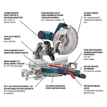 The Bosch GCM12SD is a 12 Inch Dual-Bevel Glide miter saw that features a smooth cutting motion, accurate performance and a space-saving design of the Bosch-exclusive Axial-Glide system