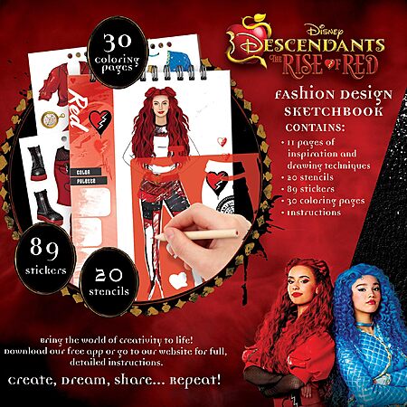 - IMMERSE YOURSELF IN THE WORLD OF DISNEY'S DESCENDANTS: The Rise of Red with a themed sketchbook designed for fashion enthusiasts. Includes 30 coloring pages featuring characters and fashion designs inspired by the bold personalities from the movie.