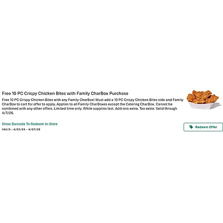 Free 10 PC Crispy Chicken Bites with Family CharBox Purchase to Rewards members through 4/7/2026.