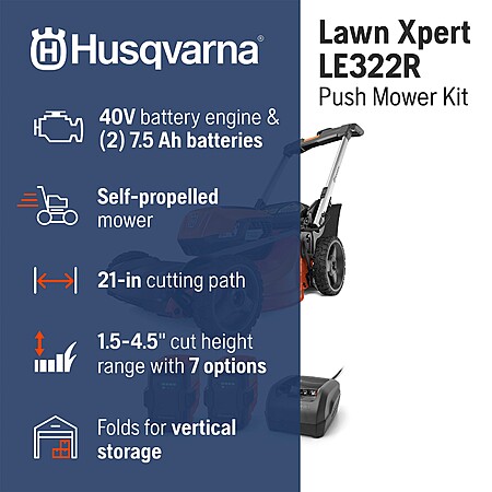 For pro-grade results, trust the pro-grade power of the Husqvarna Lawn Xpert LE-322 Battery Mower. Made for homeowner use, this electric lawn mower is ideal for mowing yards of 1/4 to 1/2 acre. Equipped with a durable, efficient brushless motor, this cordless mower is capable of slicing through thick grass 30 percent easier than with comparable mowers, all with zero emissions. An active cooling system provides consistent power and longer battery life. Choose from multiple cutting modes—including sensing, mulching and max power—with the simple touch of a button. These cordless lawn mowers feature an adjustable walk speed that lets you mow at your own pace and LED headlights to illuminate your path. These battery mowers fold up easily and stand for compact storage and transport. The mower comes with a lithium-ion battery and charger, so you can get to work right away. Husqvarna 40V batteries are interchangeable among all Husqvarna battery tools for flexible use. Husqvarna Lawn Xpert LE322R 40-volt, 21-in Self Propelled Battery Walk Mower with (2) 7.5 Ah Batteries Included | 970607602
