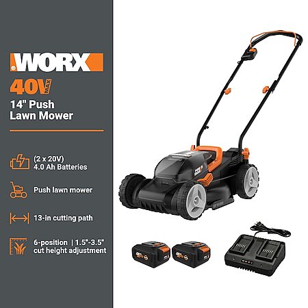 WORX Power Share 40-volt, 14-in Push Walk Mower with (2 x 20-volt) 4 Ah Batteries, Bagger Not Included | WG779.1 $199