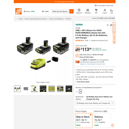 RYOBI ONE+ 18V Lithium-Ion HIGH PERFORMANCE Starter Kit with 2.0 Ah Battery, (2) 4.0 Ah Batteries, and Charger $113