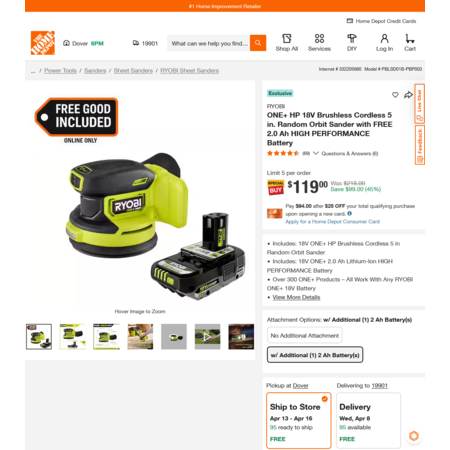 RYOBI ONE+ HP 18V Brushless Cordless 5 in. Random Orbit Sander with FREE 2.0 Ah HIGH PERFORMANCE Battery $119