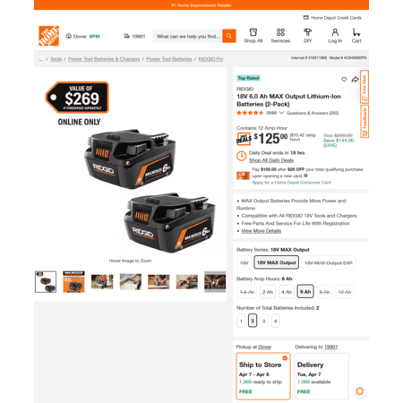 RIDGID 18V 6.0 Ah MAX Output Lithium-Ion Batteries (2-Pack) $125