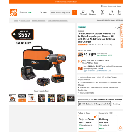 Model: RIDGID 18V Brushless Cordless 4-Mode 1/2 in. High-Torque Impact Wrench Kit with (2) 4.0 Ah Lithium-Ion Batteries and Charger
