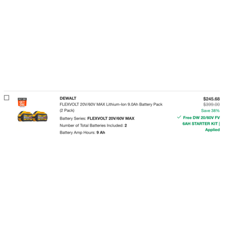 Dewalt Flexvolt 20V/60V MAX Lithium-Ion 9.0Ah Battery Pack (2 Pack) $245.68