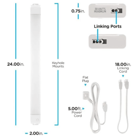 - Included mounting hardware, easy-access tabs and the ability to link up to 30 fixtures using the 18in. linking cord or optional cord lengths make customization quick and simple