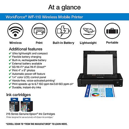 Epson Workforce WF-110 Wireless Color Mobile Printer,White, Small,Black $199.99