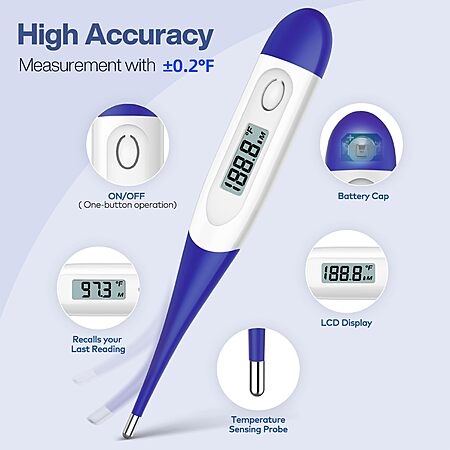 - LCD Screen Display: This oral thermometer is easy to read with clear display, beeper alarm, memory display, auto shut off, easily switch the units between ℉ and ℃