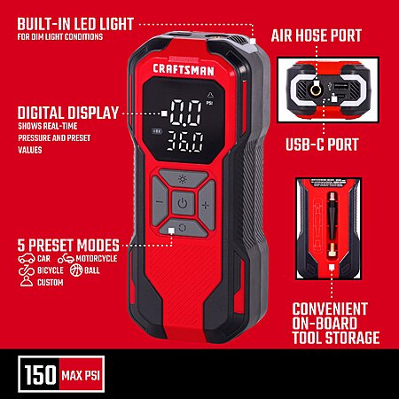 Includes- Craftsman 12V Portable Air Inflator Tool