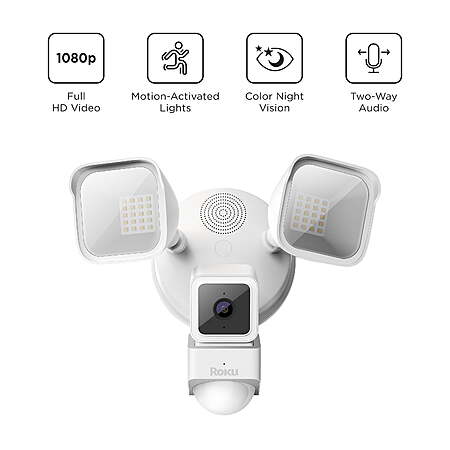 | Product Description: | Lights, camera, action, security. Roku Floodlight Camera SE (wired) keeps an eye on your driveway, backyard, or any outdoor space you need covered. See a crystal clear, live feed of an entire area up to 30 feet away with customizable 270° motion detection and HD night vision—right on the Roku Smart Home mobile app or your Roku TV™ or Player. Keep the spotlight on visitors with adjustable brightness up to 2600 lumens bulbs. Visitors of the unwelcome variety? A 105db built-in siren scares off intruders, porch pirates, and critters going after your trash. For a friendlier welcome, converse with seamless two-way audio. You don’t need to hit the lights—they come on automatically at sunset and switch off when the sun comes up. No electrician? No problem. DIY setup is a snap with guided instructions. Smile, you’re on camera: The floodlight switches on the second your camera’s 3 infrared sensors detect motion and lets visitors know they’re in the spotlight. High-definition video: View an entire 270° area up to 30 feet away in 1080p HD picture—even at night—right in the Roku Smart Home mobile app. Bright, dimmable lights: Two adjustable LED lights pack a whopping 2600 lumens of brightitude so nothing slips by unnoticed. Customizable detection: Set specific detection areas for your camera so you don’t get alerts about what’s going on in your neighbor’s yard. Smart motion and sound detection: Get an alert within seconds of your camera detecting motion or sound. Smart sensors detect body heat, so you don’t get false alerts for trees swaying in the wind. Dusk-to-dawn automation: Forget about having to remember the lights. They’ll come on at sunset and turn off in the morning (or whenever you decide). Super loud siren: Scare away unwanted visitors with a super loud 105db siren—that’s about as loud as a live helicopter in your yard. See it all on your TV: No, no—don’t get up. Pull up your camera’s feed on your Roku TV™ or Player by simply pressing a button on your remote or using Roku Voice. Built for any climate: Bring on the rain, snow, and sun. With IP65 weather resistance, this outdoor floodlight camera is fit for any climate. Make sure floodlight self-installation is legal in your state. Follow basic electrical safety guidelines when installing Roku Floodlight Cam SE. Ensure breaker is off before beginning installation. Contact a licensed electrician when in doubt. Roku Smart Home subscription: Make your home even smarter. View 14 days of cloud recordings and smart detection for people, packages, pets, and cars, so you receive only the notifications that matter to you. Roku Floodlight Cam SE is intended for home monitoring only. Check your state laws regarding placement of security cameras in public spaces. 2.4GHz Wi-Fi® required. |