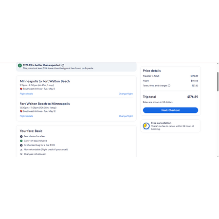 Southwest Airlines and Expedia have round trip airfares travelling to and from Minneapolis (MSP) and Destin-Ft Walton Beach FL (VPS) for $177, making 1 stop both ways.. These are basic economy fares that allow a personal item and a carry-on bag. There is no seat selection and no change.