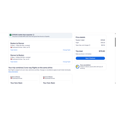 Southwest Airlines and Expedia have round trip airfares travelling to and from Boston (BOS) and Denver (DEN) for $171, nonstop. These are basic economy fares that allow a personal item and a carry-on bag. There is no seat selection and no change.