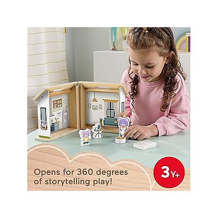 Product Details:- Decorative wooden dollhouse with built-in handle for travel-friendly preschool pretend play