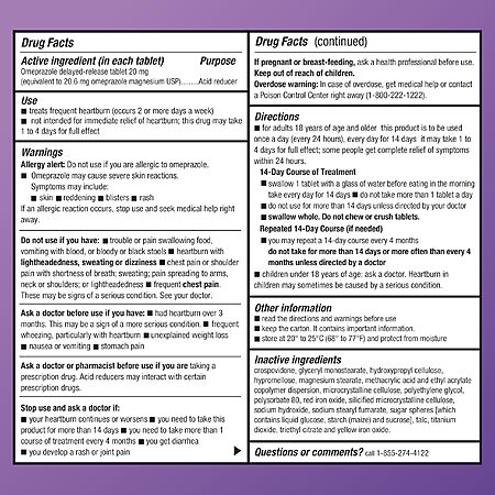 - ACTIVE INGREDIENT: The active ingredient in these delayed release tablets is omeprazole 20 mg, which works as an acid reducer to treat frequent heartburn. Compare to Prilosec OTC