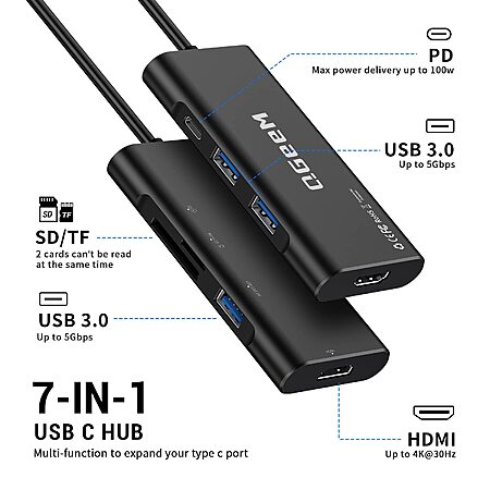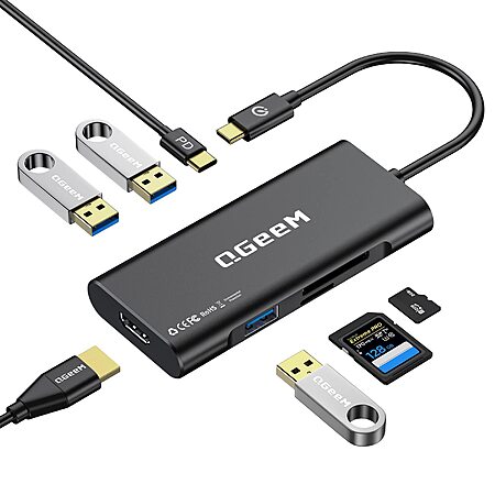 QGeeM USB-C 7-in-1 Dongle with 100W PD, 3x USB 3.0, SD/TF Card Reader, Compatible with MacBook, iPad, Dell XPS & More - Black $ + Free Shipping w/ Prime or on $35+ $9.4