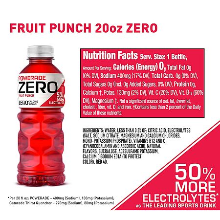Amazon [amazon.com] has 8-Pack 20-Ounce POWERADE Zero Fruit Punch Sports Drink on sale for $4.78 - 20% off when you 'clip' the coupon on product page [amazon.com] - 5% off when you checkout via Subscribe & Save = $3.58. Shipping is free w/ Prime or on orders $35+.