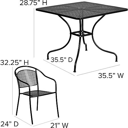 - EFFICIENT SIZE: Each chair measures 21"W x 24"D x 32.25"H and supports up to 300 lbs. of static weight; table measures 35.5"W x 35.5"D x 28.75"H