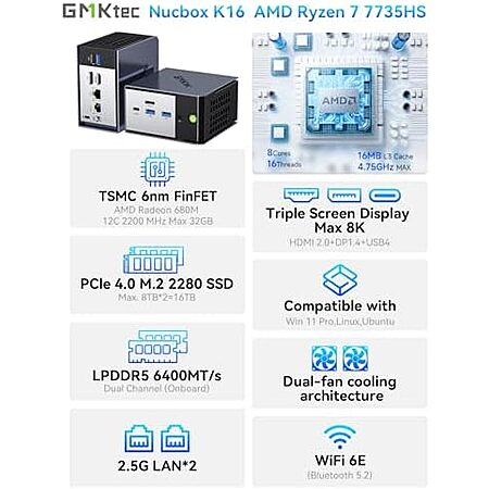 GMKtec-US via Amazon [amazon.com] has GMKtec K16 Mini PC Gaming Desktop Computer AMD Ryzen 7 7735HS (8C/16T 4.75Ghz) 32GB LPDDR5 6400MT/s RAM + 512GB SSD, Dual NIC LAN 2.5GbE, Oculink, USB4, HDMI, USB-C for $589.99.