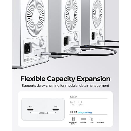 • [Daisy Chain Expansion for Maximum Storage]: Supports up to 22TB per 3.5-inch SATA HDD and offers a total capacity of up to 88TB. Expand storage by daisy-chaining up to 3 devices, providing a maximum of 264TB for large data needs, perfect for video editors and professionals working with massive files.