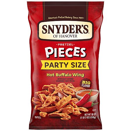 Snyder's of Hanover PARTY SIZE Hot Buffalo Wing OR Honey Mustard & Onion Flavored Pretzel Pieces, 18 Oz $4.63 S&S Clip Q YMMV