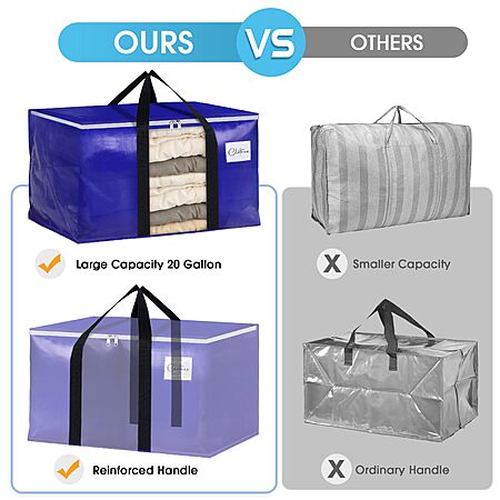 - Our moving bags measure 28.7"×11.8"×13.7" and have a storage capacity of 76 L (20 Gallon). Strong and long handles make for easy carrying. The large open top is ideal for bulky items like sheets, blankets, etc