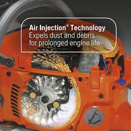 Air Injection technology expels larger dust and debris particles before they reach the air filter to improve engine life on these Husqvarna chainsaws