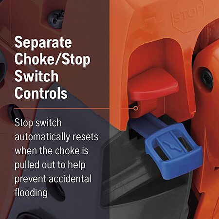 Husqvarna 455 Rancher chainsaw features a stop switch that automatically resets when the choke is pulled out to help prevent accidental flooding