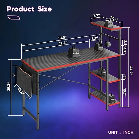 Bestier 52" Gaming Desk w/ LED Lights & Reversible Storage Shelves $50 + FS
