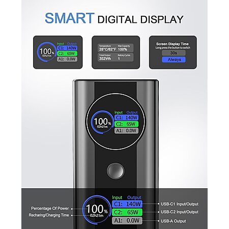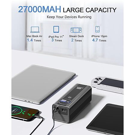 Model: Powdeom 140W Power Bank, 27000mAh 3-Port Portable Laptop Charger, Smart Digital Display, 140W USB C Fast Recharge, PD3.1 Battery Pack for iPhone, MacBook, iPad, Samsung, Steam Deck etc