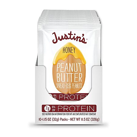 Amazon [amazon.com] has 10-Pack 1.15-Oz Justin's Peanut Butter Squeeze Packs (Honey) for $7.60 - 5% when you check out via Subscribe & Save = $6.55. Shipping is free w/ Prime or on $35+.