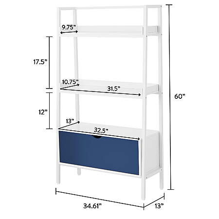 | Product Description: | The Build Your Own Furniture Kids Ladder Bookcase is a great solution to help your kids keep their space neat and organized. This bookshelf features three tiers of tapered shelving plus a spacious bottom drawer with a cutout handle. Sturdy and durable, the metal frame provides support while maintaining a modern, minimalist aesthetic. It is available in all white, white with a navy blue drawer front and white with a light pink drawer front. The versatility and simple, open design makes it ideal for kids, preteens and teens alike. Make tidying up fun and functional with the Build Your Own Furniture Kids Ladder Bookcase. Ladder bookcase with three shelves and a large drawer Drawer features a rounded cutout handle Tapered shelves with an angled metal frame Navy Blue drawer front complements white shelves and frame Assembled dimensions: 34.61" W x 13" D x 60" H (58.37 lbs) Drawer dimensions (interior): 29.25" W x 9.75" D x 9.25" H Top shelf dimensions: 31.5" W x 9.75" D Middle shelf dimensions: 31.5" x 10.75" D for a coordinated look (sold separately) Shelves can support up to 50 lbs each, drawer can support up to 22 lbs Attaches to the wall with included mounting hardware for safety Materials: manufactured wood & metal Adult assembly required (hammer, Phillips head screwdriver & flat head screwdriver needed) Package size: 64.37" x 15.94" x 6.34" (67.1 lbs) |