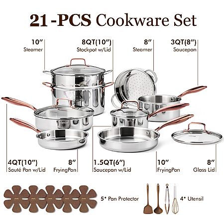 $119.99: CAROTE 21pcs Tri-Ply Stainless Steel Cookware Set, Pots and Pans Set, Mirror Polish