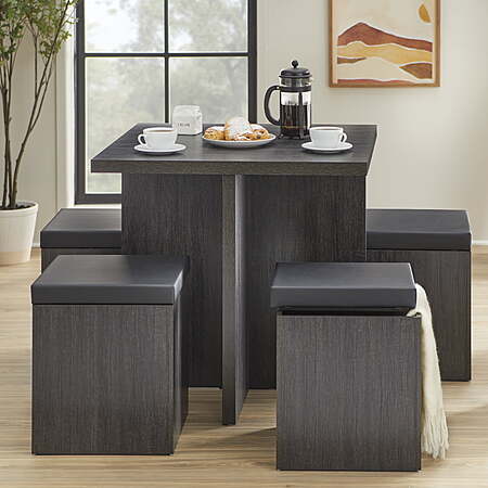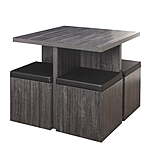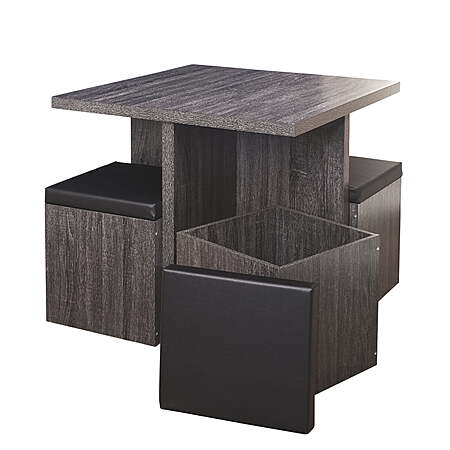 | Product Description: | Creating distinct look perfect for small homes, apartments, condos, and more, the Mainstays 5-Piece Dexter Dining Set features a square table and four stools. With a reclaimed, natural look finish, this compact set blends with almost any décor. Stools crafted with a faux leather-covered foam seat in black and function as storage ottomans for stowing your tablecloths, placemats, table accessories, and more. Durably constructed of laminated MDF, this set is ideal in an eat-in kitchen, breakfast room, sunroom, or anywhere else you would like to gather with family and friends. The Mainstays 5-Piece Dexter Dining Set's compact modern style is ideal for small homes, apartments, condos, and more Perfectly sized for eat-in kitchens, breakfast rooms, sunrooms, or anywhere else a functional dining set is needed Distinct look blends in with almost any décor Seats also function as storage ottomans that are ideal for tablecloths, placemats, other table accessories, etc. 100% MDF construction table with a reclaimed gray finish The faux leather covered foam seat provides a comfortable cushion in an elegant shade of black Assembly instructions included. Table: 31" W x 31" L x 29.7" H Storage Ottoman: 15" W x 15" L x 18.75" H Assembled product weight: 95 ibs |