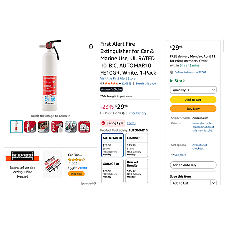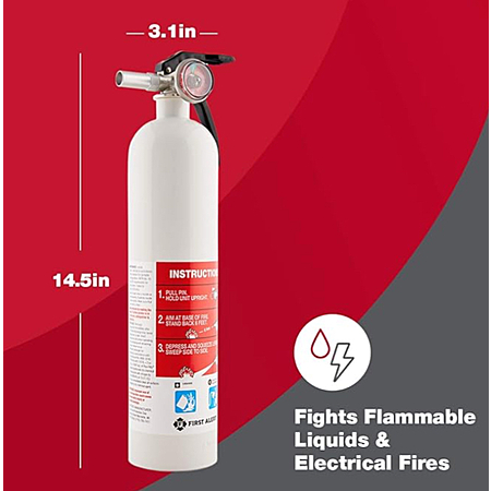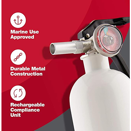 First Alert's AUTOMAR10 Marine Fire Extinguisher is UL rated 10 B:C; It features a durable metal head and commercial grade valve and trigger