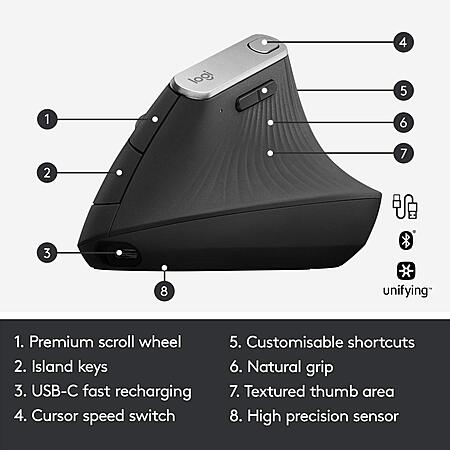 $74.99: Logitech MX Vertical Wireless Mouse – Rechargeable, Graphite