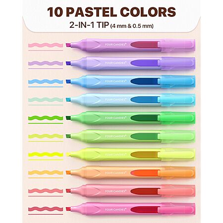 Product Description from Amazon:- Brighten your notes with Four Candies highlighters. This 10-color highlighter set is perfect for highlighting key information and adding vibrant accents. Soft chisel tips make studying, journaling, and everyday tasks more colorful and organized