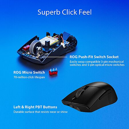 Model: ASUS ROG Keris Wireless AimPoint Gaming Mouse, Tri-mode connectivity (2.4GHz RF, Bluetooth, Wired), 36000 DPI sensor, 5 programmable buttons, ROG SpeedNova, Replaceable switches, Paracord cable, Black