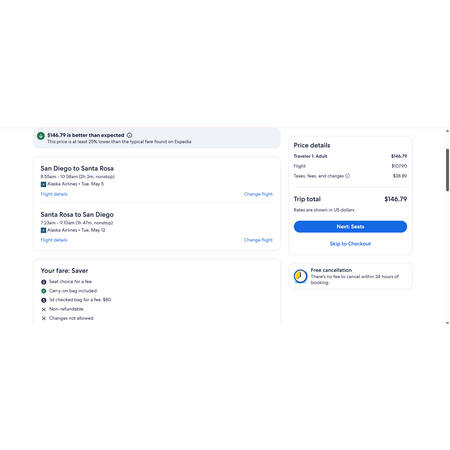 Southwest Airlines, Alaska Airlines and Expedia have round trip airfares travelling to and from San Diego (SAN) and Santa Rosa CA (STS) for $147, nonstop. These are basic economy fares. On Alaska , you are allowed a personal item and a carry-on bag. Plus passengers ages 21+ may check-in one case of wine for free. Selections should be placed in a standard wine shipping box or wine suitcase that meets checked bag requirements. A "case" is defined as a single box or specialized wine suitcase containing up to twelve (12) bottles and weighing no more than fifty (50) pounds.