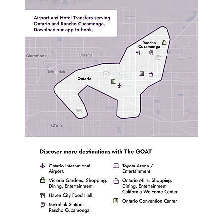 Free shuttle transfers between the airport, hotels, and key destinations in Ontario and Rancho Cucamonga CA (see the list below). The GOAT (Greater Ontario Area Transportation) offers free instant shared rides to pre-booked airport transfers. For airport transfers, you can pre-book your ride ahead of time for guaranteed availability. For all local trips (like dining, shopping, and conferences), you can request a ride instantly, on-demand. Monday–Sunday, 8am–10pm.