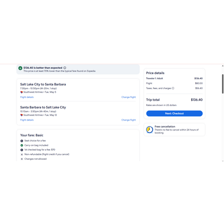 About 70% lower than usual according to Expedia, Southwest Airlines and Expedia have round trip airfares travelling to and from Salt Lake City (SLC) and Santa Barbara CA (SBA) for $137 making 1 stop in Vegas, Denver or Oakland. I'd choose Vegas because there are slot machines in the airport for your entertainment! . These are basic economy fares that allow a personal item and a carry-on bag. There is no seat selection and no change.