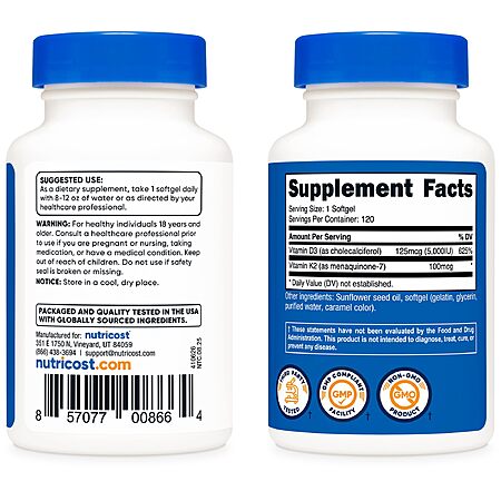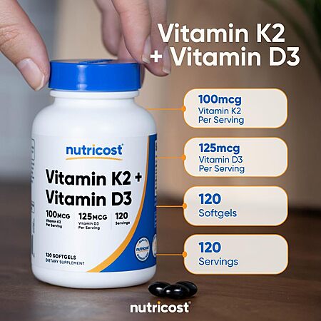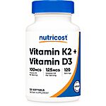 Nutricost Vitamin D3 + K2 (5000 IU D3 / 100mcg MK7), 120 Softgels – Gluten-Free & Non-GMO $10