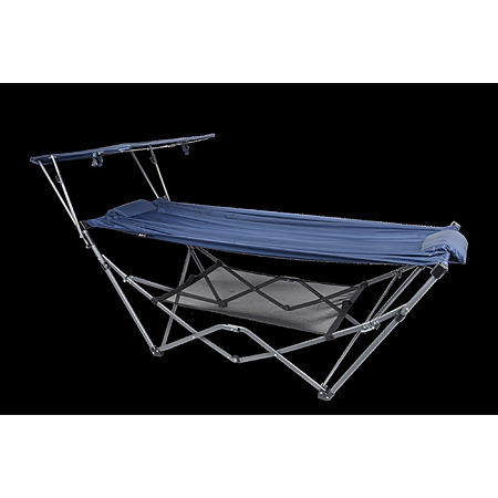 Kick your feet up and ensure you always stay in the shade with the Ozark Trail Hammock with Canopy. This product features a strong, rust resistant steel frame that opens and closes easily allowing you to take hammock comfort with you anywhere you go. This hammock with stand supports up to 250 pounds and measures 72 inches x 32 inches x 29 inches giving you plenty of room to stretch out and relax. It also features an adjustable canopy to allow you to stay in the shade at all times. When it’s time to go, the stand folds down and fits into the included carry bag for easy storage and transportation. Are you ready to get hammock comfort anywhere without needing trees for setup? If so, make sure to grab to Ozark Trail Hammock with Canopy and relax in style at the campsite, in your backyard or anywhere else. 72" x 32" x 29" Adult use Strong, rust resistant steel stand sets up quickly and easily Adjustable canopy keeps you in the shade at all times Includes a carry bag for easy storage Weight capacity (pounds): 250 lbs. Product weight (inches): 15.4 lbs. Open dimensions (inches): 72" x 32" x 29" (without canopy) Closed dimensions (inches): 3” x 8.3” x 34.2” Blue Adult use